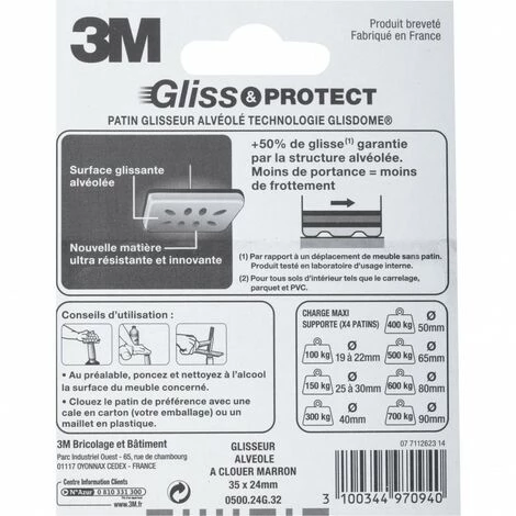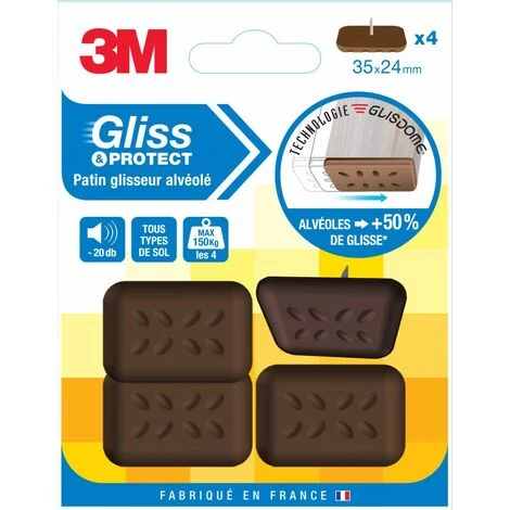 Patins dotés de la technologie Glisdome : la structure alvéolée garantit +50% de glisse (par rapport à un meuble non équipé en patin) offrant ainsi moins de portance et moins de frottement. Le mécanisme de la rotule articulée et mousse compensatrice facilite le franchissement des irrégularités du sol. Adhésif extra fort. Permettent de réduire le bruit. Charge max. supportée : 150Kg.