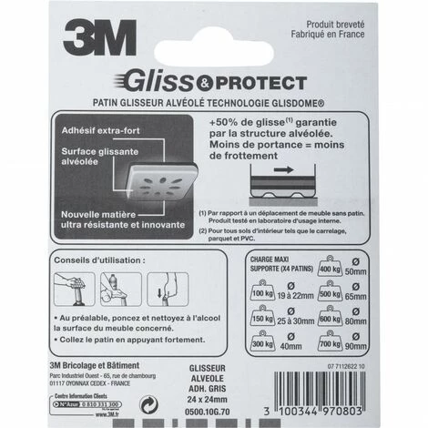 Patins dotés de la technologie Glisdome : la structure alvéolée garantit +50% de glisse (par rapport à un meuble non équipé en patin) offrant ainsi moins de portance et moins de frottement. Le mécanisme de la rotule articulée et mousse compensatrice facilite le franchissement des irrégularités du sol. Adhésif extra fort. Permettent de réduire le bruit. Charge max. supportée : 150Kg.