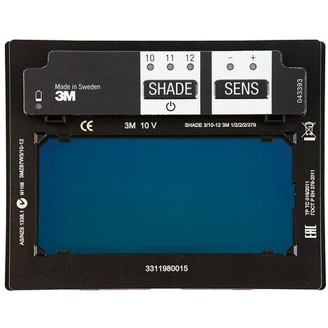 Bouclier 3M V10 avec filtres automatiques 3-10/11 /12 (12 unités). Le nouvel écran de soudage 3M 10V se caractérise par sa grande polyvalence et sa simplicité. Il s’agit d’un écran avec filtre automatique et tonalité d’obscurcissement variable. Il permet de choisir entre trois tonalités, 10, 11 et 12. Nouvel écran d’excellente qualité. Couleur noire, 390gr.